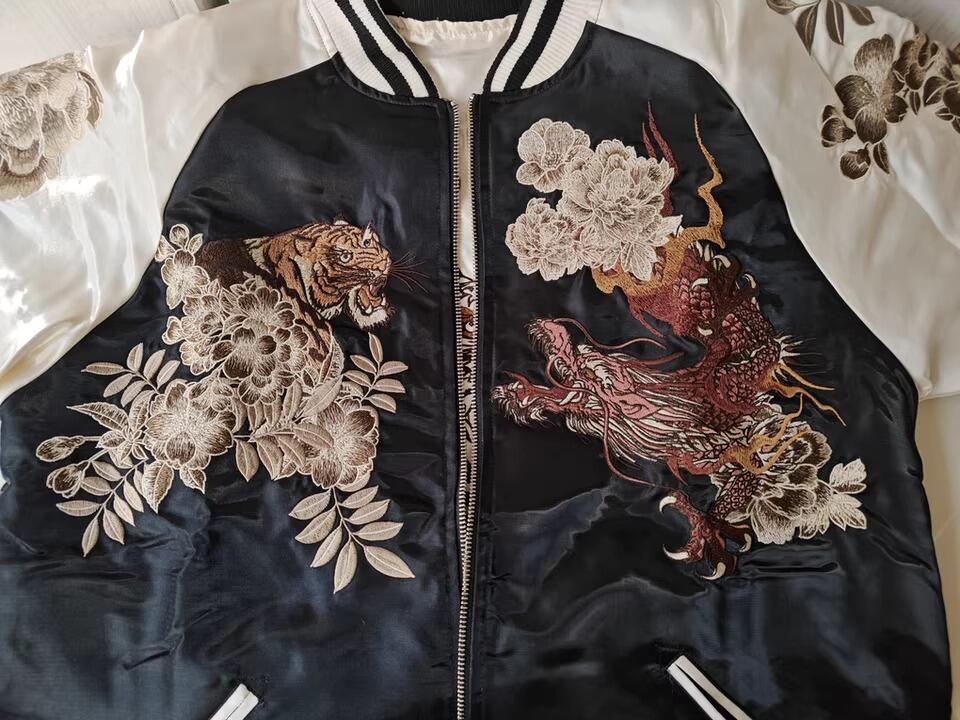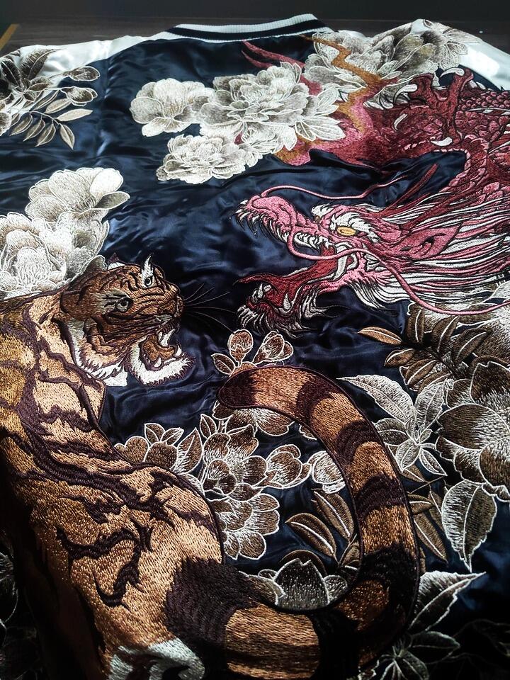 All our sukajan jackets use dense machine embroidery on satin — no printed fake stitch textures.